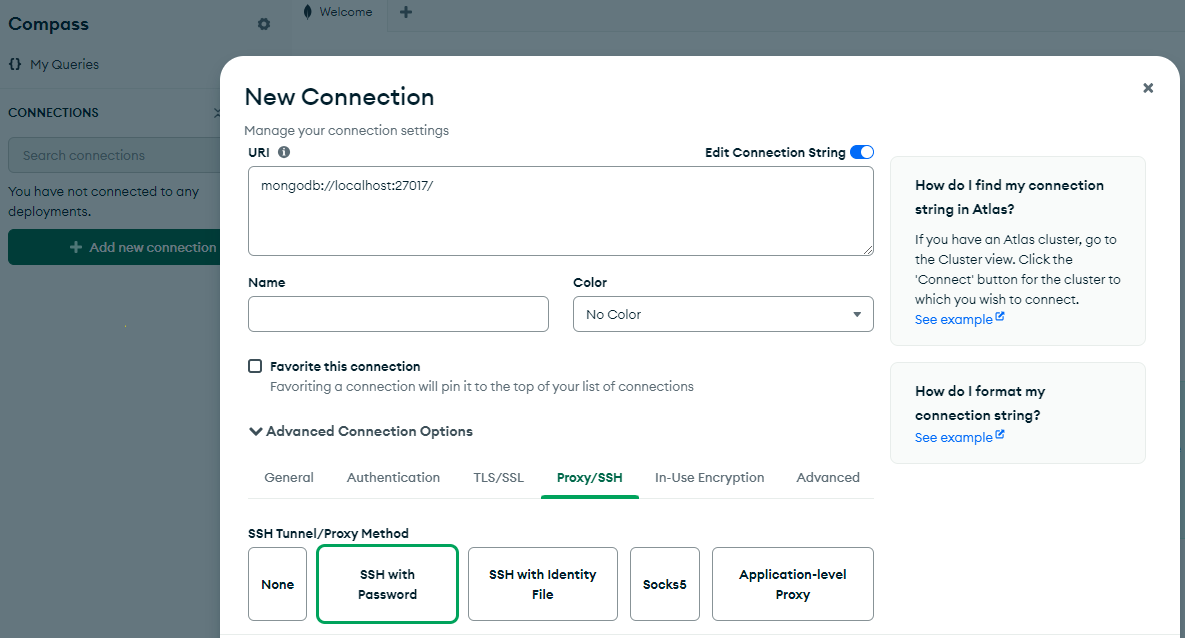 - Using Compass, make a Connection to your MongoDB deployment