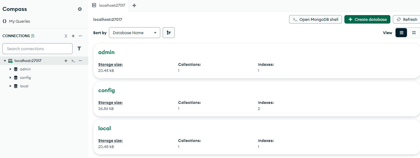 The following is an example screen when you are successfully connected to MongoDB Compass