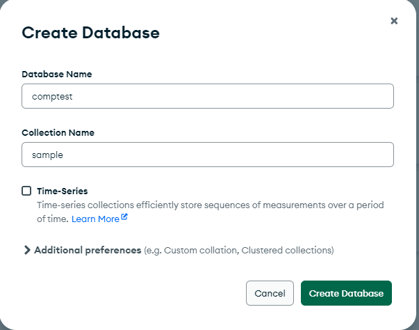 Specify comptest as the database name and collection name as sample and then press create database button.