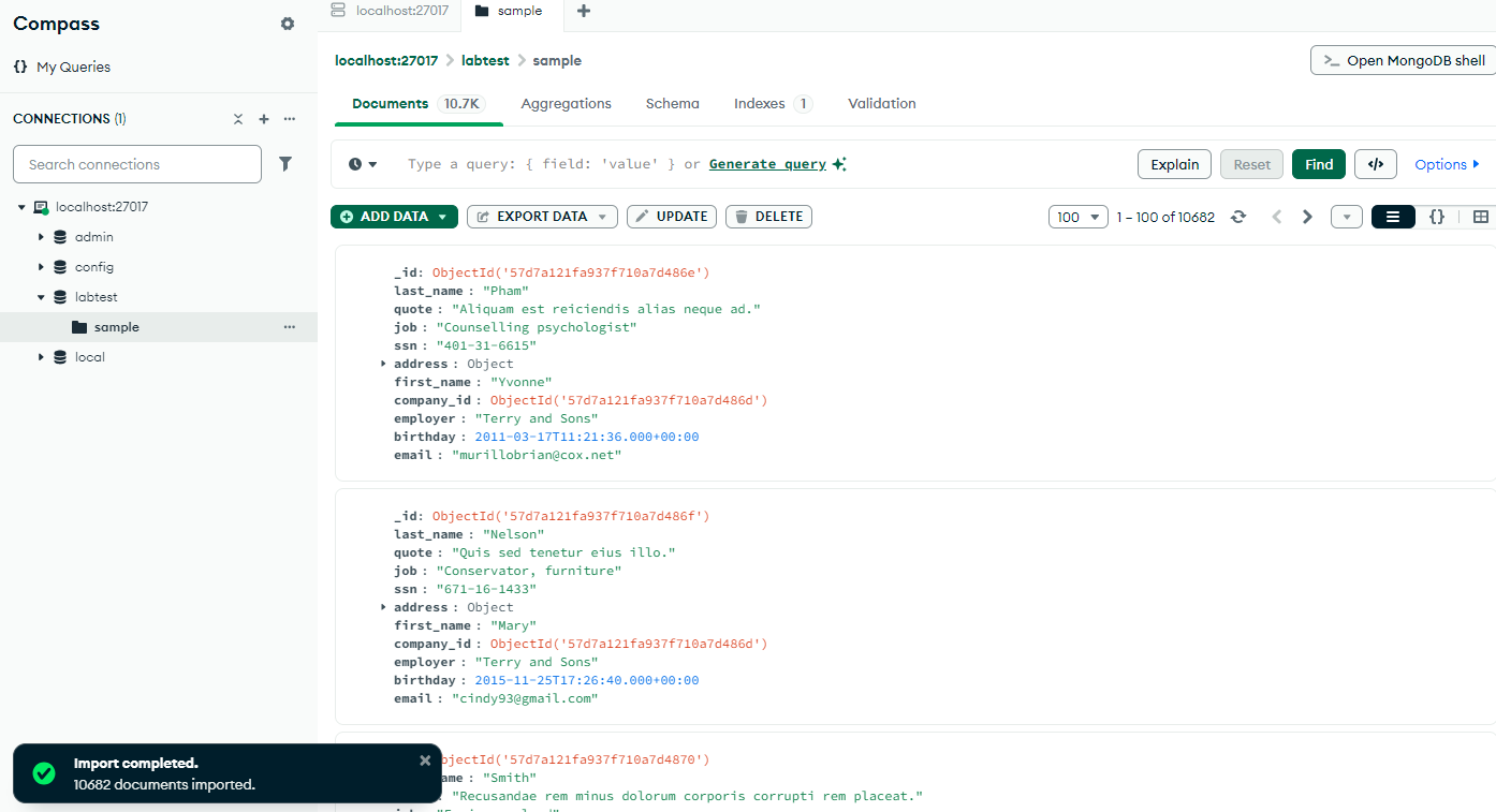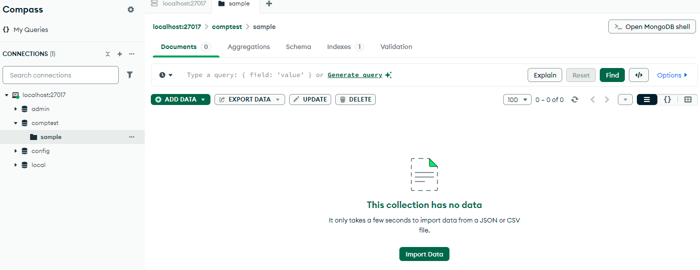 In this step we are going to import documents into the sample collection of the comptest database
